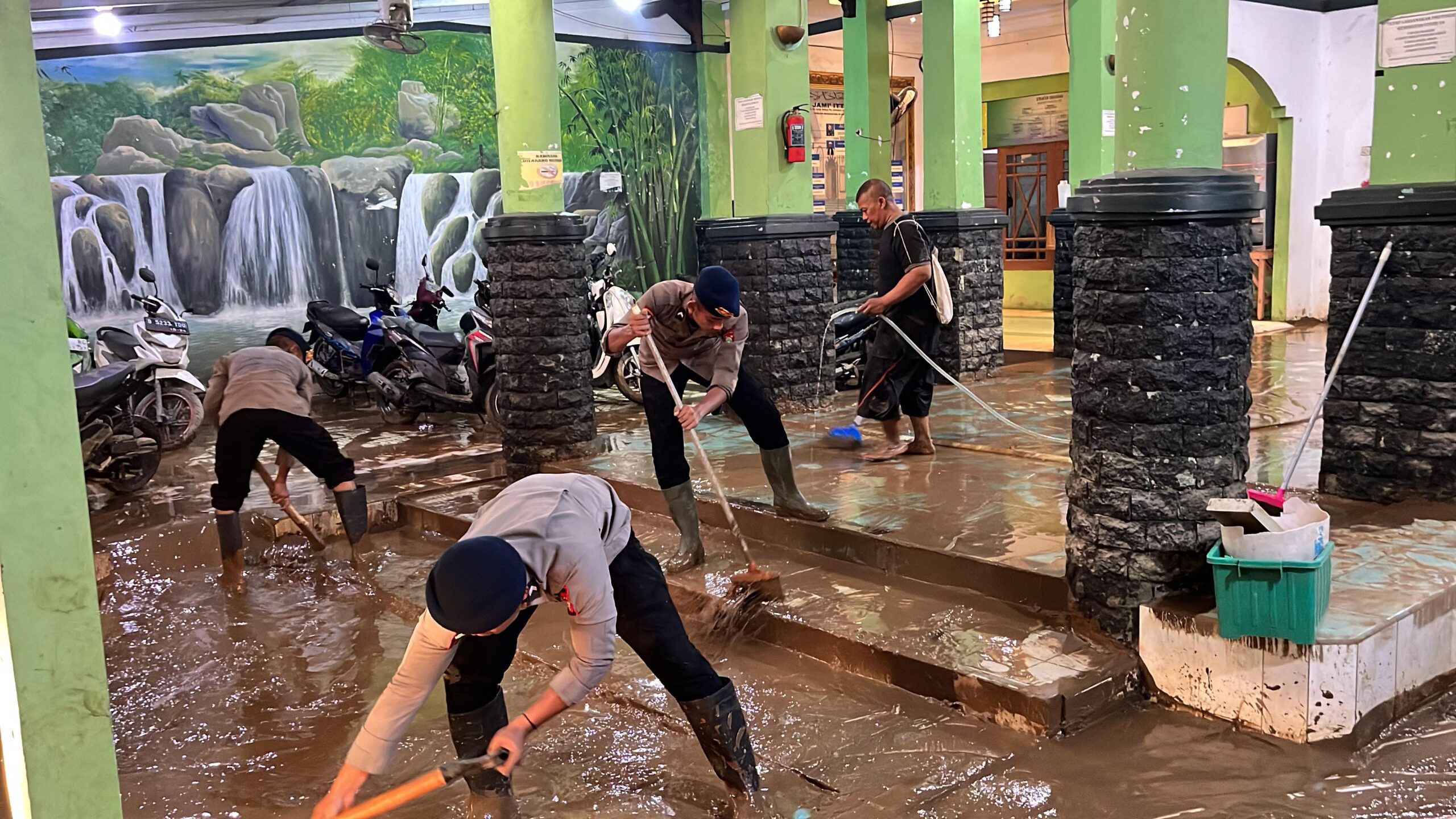 Dengan menggunakan alat seperti pengki, cangkul, sekop, dan sapu ijuk, para personel Brimob bekerja sama membersihkan lumpur yang menutupi rumah-rumah warga.