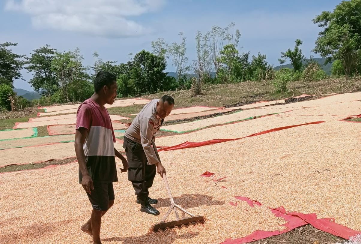 Hal itu ditunjukkan oleh Bhabinkamtibmas Polsek Monta Polres Bima Polda NTB Bripka Suharmayo yang berbaur langsung dengan warga binaan di Desa Tangga Baru Kecamatan Monta Kabupaten Bima membantu proses penjemuran jagung milik warga.