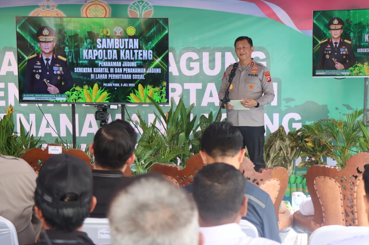 Pulang Pisau — Kepala Kepolisian Daerah Kalimantan Tengah Irjen Pol Iwan Kurniawan melakukan penanaman jagung kuartal III di lahan perhutanan sosial, Desa Kalawa, Kecamatan Kahayan Hilir, Kabupaten Pulang Pisau, Rabu (9/7/2025).