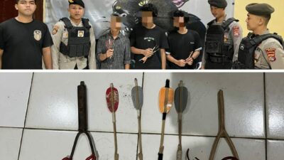 Saat melaksanakan patroli petugas melihat tiga orang remaja yang mengendarai sepeda motor dengan gerak gerik mencurigakan. dan setelah didekati serta dilakukan pemeriksaan atau penggeledahan petugas menemukan 4 busur panah dan ketapel yang diduga kuat untuk melakukan tindakan kejahatan.