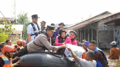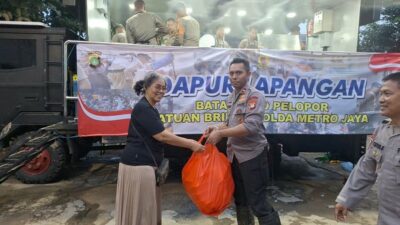 Jakarta. Satuan Brimob Polda Metro Jaya mendirikan dapur lapangan untuk membantu warga terdampak banjir di Perumahan Pondok Gede Permai